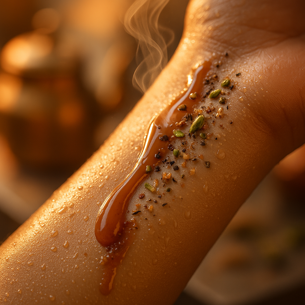 As it settles, the tea grows chewier, a little smoky, a little malted. Cinnamon and clove feel present but never sticky. A dusky sweetness peeks in, think brown sugar or jaggery warmth, then drifts into a woody skin glow. The drydown is all comfort with backbone, a soft sweater over a steel spine. Sillage starts lively, then hugs closer, which is perfect for a scent that feels intimate yet bright eyed.